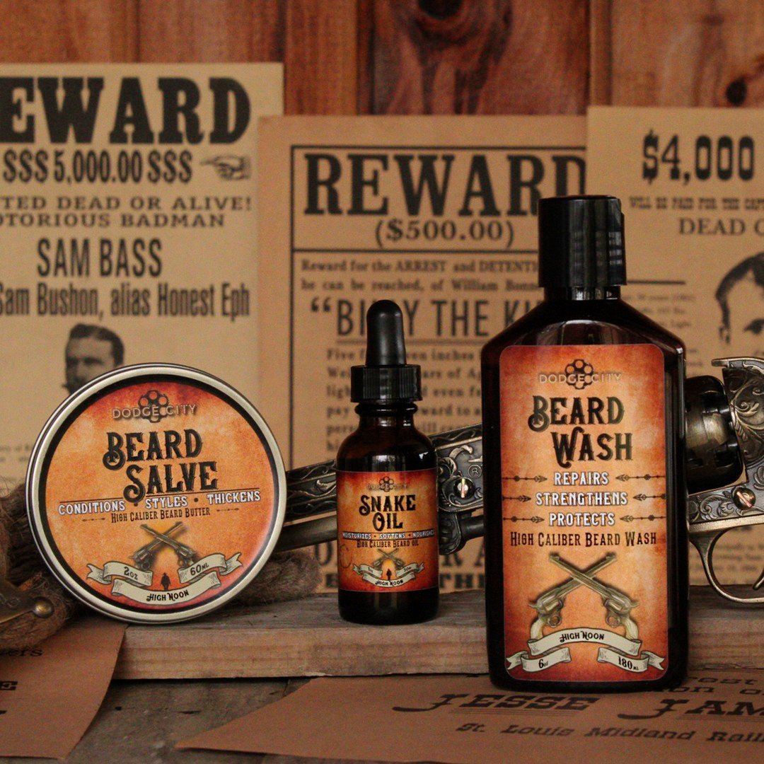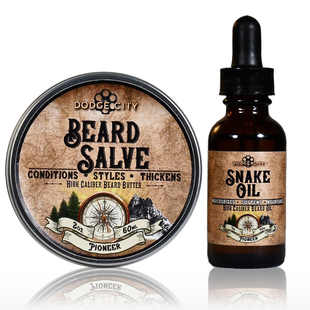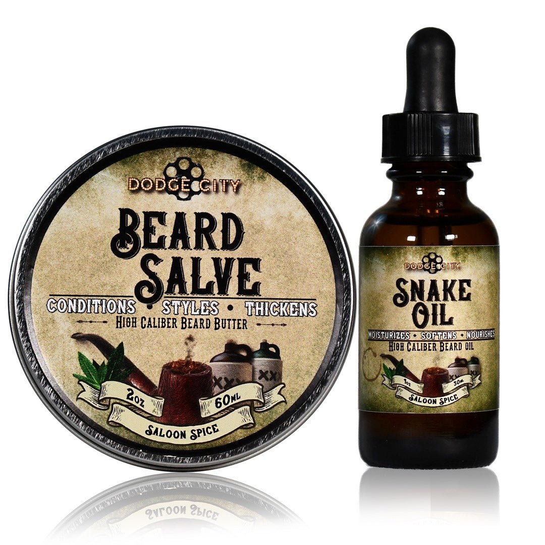 Our Double Tap Combo provides non-greasy Snake Oil that turns your skin into a beard producing machine, along with Beard Salve that softens, conditions, and thickens your beard. Look like a gunslinger with Dodge City’s Double Tap Combo!